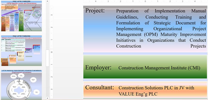Professional Standards and Certification for Engineering and Architecture Employer: Ministry of Housing and Infrastructure Development – Construction Management InstituteType of service: Inspection and EvaluationForm of delivery: in Sub-consultancy with Construction Solutions PLCTime of Delivery: April 03, 2022 – October 30, 2022 Major Scope of the Works Develop Organizational Project Management (OPM) improvement initiative manual tailored to the Ethiopian construction sector firms;