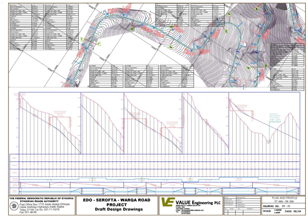 Serofta - Warqa Road Design Project The project is a road upgrading project that is designed to asphalt concrete (AC) surfacing. Employer: Ethiopian Roads Authority/AdministrationType of service: Route Selection, Feasibility Study, ESIA, Detailed Engineering Design, RAP Preparation and Tender Document PreparationTime of service: October, 08, 2013 – August 10, 2015Location: Oromia RS, Ethiopia Major Scope of the Works Route SelectionTopographic SurveyingSub-grade Soil InvestigationBridge Foundation Sub-surface InvestigationConstruction Material InvestigationFeasibility StudyDetailed Engineering DesignEnvironmental and Social Impact AssessmentResettlement Action Plan PreparationRight-of-way Obstruction Identification and MarkingEngineering Cost EstimatingTender Document Preparation Key Features of the Project Design of 52.97km long asphalt concrete (DC-6) roadConsiderable escarpment and mountainous sectionsLandslide-prone stretches Five major (bridge) structures4.98km of town and kebele sections Special Features of the Project Geophysical investigation to characterize the deep cut subgrades and structures